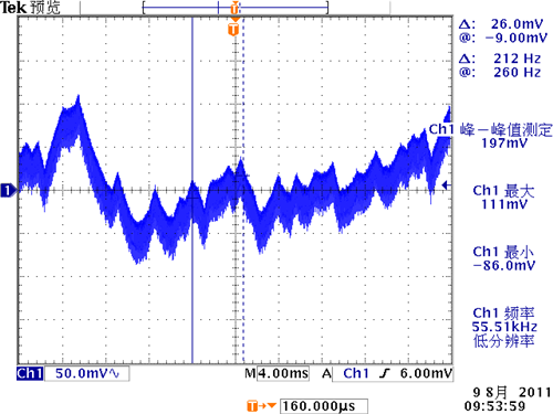 低頻紋波是與輸出電路的濾波電容容量相關(guān)。由于直流電源體積的限制,電解電容的容量不可能無(wú)限制地增加,導(dǎo)致輸出低頻紋波的殘留,該輸出紋波頻率隨整流電路方式的不同而不同。